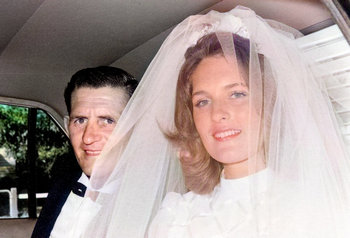 Mr & Mrs Jefferies arriving for the reception dinner and celebration, held at Ted's local pub, the Rivervale Hotel.