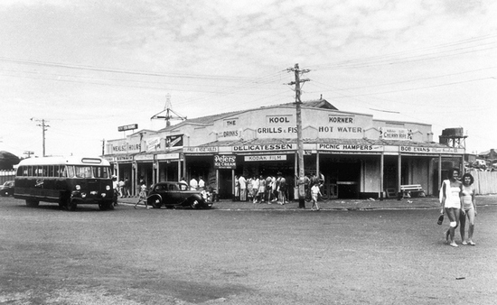 This is Kool Korner, which was located where Zanders is now. When this photo was taken in the late 1930s, Kool Korner was the local hub. It was demolished in 1954 to make way for a new hotel, however the liquor license was knocked back.