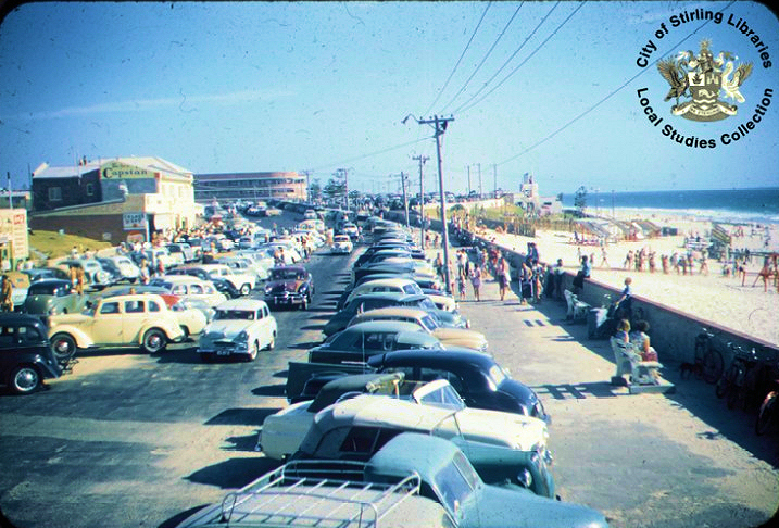 Looking south over the car park on Scarborough Beach Esplanade in the 1950's. Source: City of Stirling Local Studies Library