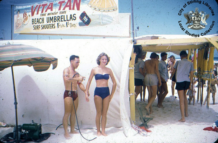 Ben Burke had a sun tan oil spray booth on the beach in Scarborough. He used mutton bird oil from Tasmania. Ben also ran the rubber surf shooter hire business along with the sun tan business. Source: City of Stirling Local Studies Library