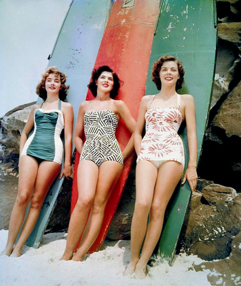 Swimwear of the '50s - 1952 Miss Pacific finalists Mary Clifton Smith, Pamela Jansen and Judy Worrad, stand in front of surf boards. Source: Dictionary of Sydney